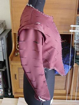 The sleeves were then cut, and slashed in the same fashion as the front. Once they were sewn together, the wings were made for the top of the armholes, cored with one layer of linen. The wings were tacked in place and sewn, followed by the sleeves.