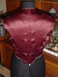 Button holes were measured out, and cut. Each button hole is hand stitched around the edges with a button hole stitch for finishing. The gold sateen reacted worse than the red outer shell to being slashed. The buttons were made of linen wads, glued to a sateen outer shell, and shanked.