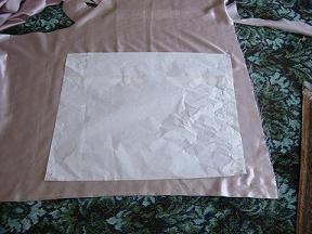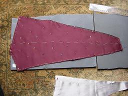 The back linen sections were then cut along with the layers of sateen for the outer shell. These were then tacked together and marked out for slashing. The original calls for pinking rows in-between the slashing, but on actually trying this, it was found to not be feasible. The pinking (with various implements) proved to pull threads in most cases, ruining the section of sateen. After these failures the pinking option was abandoned in favour of just slashing.