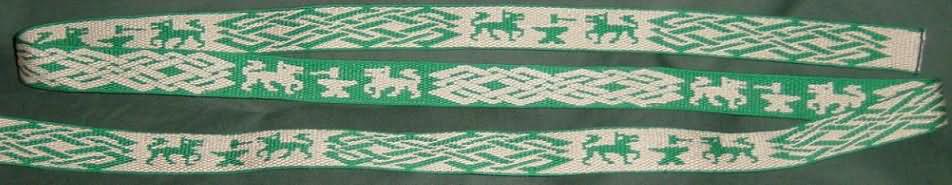 Custom belt using various patters, including interlaced knot work, anvil and hammer and wolves. Around 1” wide, 70” long. The belt is woven in a double-faced technique allowing the pattern to be a mirror image on the back with the colours reversed.Pictures: